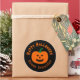Halloween sticker gift tags with an orange pumpkin lantern on a black background. The "Happy Halloween" greeting and who it is from can be changed.