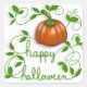 Simple and cute orange pumpkin with green pumpkin vines twisting and turning to spell happy Halloween in handwritten script. Ideal for the season, a family and friends halloween gathering, favour bags and more.