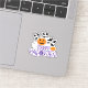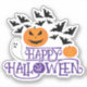 Cool, fun and unique Halloween Party Supplies sticker for anyone. With custom purple text Happy Halloween. Orange Halloween pumpkins jack O'lanterns, white ghosts and black bats. Cute fun and a little spooky pattern for kids of all ages.