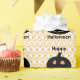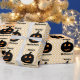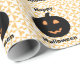 Festive Happy Halloween pumpkins sit atop a custom digitally designed pattern of streaming abstract pinwheel shapes.