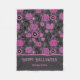 A cute and pretty Happy Halloween blanket featuring pumpkin and floral patterns in purple and black, perfect for families looking for fun and modern ways to celebrate Halloween this fall.