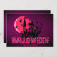 Happy Halloween card with scary castle and flying bats on purple pink moon background. Cute halloween gift for everyone. The text of wishes can easily be personalised