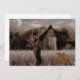 Scary skeleton reaper stands in the field holding his rusty scythe, behind him is an old, rustic, distressed barn in the country. Happy Halloween greeting in lower right corner.