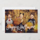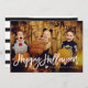 Modern holiday card featuring the words "happy halloween" in a white, handwritten script with your photo displayed behind. White overlay, heart and text can be positioned anywhere on the card. The back of the card features a black and white watercolor striped pattern.