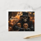 Skeleton in a vintage tuxedo and hat with modern bicycleand halloween decorations. Happy Halloween Postcard