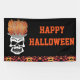 Wish your neighbours, customers, family and friends a Happy Halloween. Halloween banner features a skeleton skull head with a grey hat and flames. Design also features a tribal flame border. Perfect for advertising, birthday, Haunted House, Fundraisers, and other October events.
