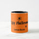 Happy Halloween! Mug with spiders and webs on it. Orange background and black border around it, and says "Happy Halloween" on it. Also has: Lynne Smith" that you can change to whatever you want on it. Great to use for a Halloween party. Just fill the cup with treats to give out as favours.