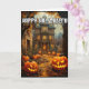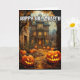 This super unique greeting card features an illustration of a haunted mansion guarded by a pair of glowing pumpkins. Please feel free to adjust all the available options as you wish.