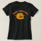 Halloween tee shirt with pumpkin carved to a jack o'lantern and text of Happy Halloween. Suitable for all ages and genders.