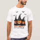 three glowing pumpkins carved with scary faces, each wearing a black witch's hat. In the background, black bats are flying in the sky. The design includes the phrase "Happy Halloween" at the bottom, along with an invitation to join at midnight written in English, "Come to join us at midnight." The colours focus on the orange of the pumpkins and the dominant black of the hats and bats, creating a spooky and fun atmosphere that fits the Halloween theme.