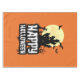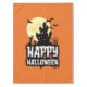 Happy Halloween text design illustration with haunted house, cemetery and bats decoration at full moon on orange background