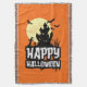 Happy Halloween text design illustration with haunted house, cemetery and bats decoration at full moon on grunge orange background