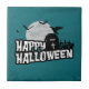 Happy Halloween text design illustration with cemetery and bats decoration at full moon on grunge blue background