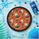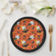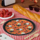 Happy Halloween paper plate featuring a smiling vampire bat on a full moon night.