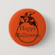 Happy Halloween witch button. It is Orange and black Happy Halloween with a screeching black cat can be customised to add names, text, or sayings. Click "customise it" to add yours. It is great for fun Halloween gifts and treats!