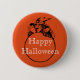Happy Halloween witch button. It is Orange and black Happy Halloween with a screeching black cat can be customized to add names, text, or sayings. Click "customize it" to add yours. It is great for fun Halloween gifts and treats!