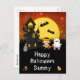 This fun and spooky Halloween card can be personalised with a name or title, such as daughter, granddaughter, niece, friend etc. It features a cute witch and ghost beside a crooked haunted house. In the background is a full moon with bats and an orange night sky with stars. The text combines decorative and serif fonts for a stylish and modern look. This is perfect for Halloween.