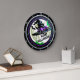This spooky Halloween clock features a large black witch's hat with a purple bow on top of a moon with green splatter effects. A bat silhouette is flying near the hat. The text "HAPPY HALLOWEEN" is prominently displayed. The clock has a black border with white numbers 1-12.