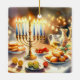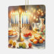 Hanukkah watercolor illustration. A beautifully arranged table set for a festive celebration, featuring a traditional menorah with lit candles. Soft, warm light, while holiday decorations add a touch of cheer. Warm lights creating a cosy, inviting atmosphere.