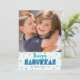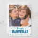 “Happy Hanukkah.” Fun, playful, whimsical handcrafted typography along with a random Star of David pattern in light blue and faux gold foil, all overlaying light aqua blue hand drawn lines on a white background, along with a photo of your choice, help you usher in Hanukkah. Hand drawn turquoise lines overlay a navy blue background on the back. Feel the warmth and joy of the holiday season whenever you send this stunning, colourful, personalised Hanukkah greeting card. Matching stickers, pillows, wrapping paper, serving trays, home décor, and more are also available. Make this Hanukkah one to remember!