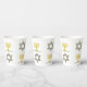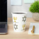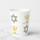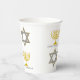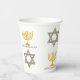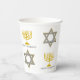 Elegant HAPPY HANUKKAH paper cups showing faux gold and silver STAR OF DAVID and MENORAH in a tiled pattern. Text reads HAPPY HANUKKAH and is CUSTOMIZABLE, so you can PERSONALIZE it by adding your name or other text. Ideal for Hanukkah celebrations.