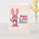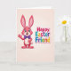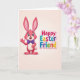 This card shows a friendly, human-like hare on the left, colored in bright pink with softer blush tones on its inner ears and belly, giving it a gentle, affectionate look 🐰. It lifts one paw in a small wave, and its big blue eyes with fine lashes and an open smile suggest it’s greeting someone it truly likes. A neat purple bow tie at its neck adds a sweet, dressed-up touch, like it’s shown up for a special visit with a close friend. On the right side, a festive Easter greeting appears in large, chunky letters, each one filled with a different strong color such as teal, yellow, purple, green, orange, and fuchsia, with a white center and a thin pink outline 🌷. The text sits in a compact group, balancing the hare so the two sides feel like they’re facing each other across the space. Behind everything is a warm beige background with a soft gradient that keeps the focus on the character and the colorful words. A small, fluffy white tail peeks out behind the hare, tucked near the lower left edge.