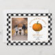 Illustration of a pumpkin. Border is black and white buffalo plaid pattern. Personalise with your text and photo.