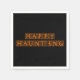 "Happy Haunting" ornamental text in vibrant orange letters, a humourous and sophisticated design for a haunting Halloween