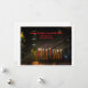 The image depicts a Hanukkah card featuring a nighttime cityscape with a brightly lit menorah in the foreground. The menorah has nine candles, all lit, symbolising the eight nights of Hanukkah. The card includes the message "Happy, Healthy Hanukkah 2024" and a personalised greeting from Jack & Jill to the Smith family.