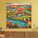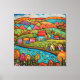 A joyful and vibrant painting showcasing a whimsical village nestled among rolling hills. The artwork features a playful colour palette and whimsical details, creating a cheerful and imaginative scene.
