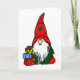 A cute cartoon gnome dressed in green and red with brightly wrapped presents