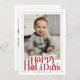 A cheerful and modern holiday design featuring a large photo framed by a clean white border and a thin, elegant outline. Bold red lettering spells out “Happy Holidays” in a playful, stylish font with festive ornament details integrated into the text. The layout feels bright, warm, and welcoming, making it a perfect backdrop for family photos, baby portraits, couple shots, or seasonal snapshots. The back includes space for two additional photos and a personalized holiday message, giving you plenty of room to share your warm wishes in a polished, contemporary style.