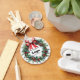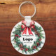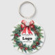 Custom "Happy Holidays" keychain for clients personalized with your business logo, a festive wreath, and an elegant red bow. Company promotional supplies for the Holidays, you can order in bulk for your employees or as branding and marketing supplies to promote your store to customers.