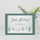 Elegant country holiday flat cards with "Happy Holidays" in handwritten style calligraphy along with your personalised family name or names and the year in a blue spruce pine coloured, rustic style typography. An artistic scenic view of trees and winter snow highlights the front of the card accented in a pleasant, pine green frame. The back of the card, also in pine green, features a text space for your personal holiday message or can be left blank for you to handwrite one if needed. Available in high quality printed card stock for standard mailing or a downloadable, digital format for quick and easy sending via text message, email or even self print.