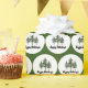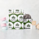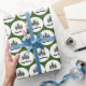 This roll of Christmas wrapping paper features an green background with a pattern made up white circles and three evergreen trees. The top in the circle reads Happy Holidays.