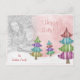 Spread holiday cheer with this cute, fun, custom post card. Various colourful country contemporary Christmas trees decorate a landscape that is home to a holiday message and a family photograph.