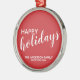 Red and White Modern Holiday Ornament featuring title 'Happy Holidays' in white modern script font style with family name in white modern sans serif font style on red background.