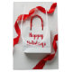 A Christmas holiday white gift bag sits centrally on a light background, its vibrant red ribbon gracefully flowing around it, adding an elegant touch.