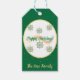 Happy Holidays- white green background, gold glitter dots, green red snowflake ornaments