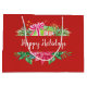 This design has a solid red background, which can be customised. In the centre, there's a wreath made up of evergreen ferns, poinsettias and, pink and green gift boxes. The scripted text reads "Happy Holidays" and can be personalised with your own message. Gift bags are available in large, medium and small.