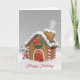 Cute Christmas gingerbread cabin in the snow with a welcome sign on the red door