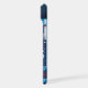 A phone case with a dark blue background, decorated with a festive "Happy Holidays" design. The word "Happy" is written in a playful, colorful font, with each letter having a different pattern: the "H" has red and white candy cane stripes, the "a" is red with white polka dots, the first "p" is red with blue polka dots, and the "y" has blue and white stripes. Above the "a" is a small cartoon Santa Claus figure. The word "HOLIDAYS" is written below in a mix of red, white, and blue letters. The background is filled with white and red snowflakes and stars of various sizes. The top and bottom edges of the case have a decorative border of blue stripes and small white stars.