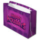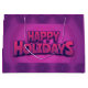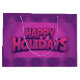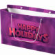 A vibrant purple holiday gift bag with bold "Happy Holidays" text.