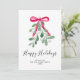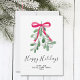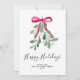 This holiday card is decorated with watercolor green mistletoe, a red ribbon, and stylish script typography that says "Happy Holidays"