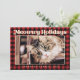 Design is composed of red and black plaid/tartan pattern. Add a custom photo of you with your pet cat. The photo is adorned above with unique gold greetings - "Meowwy Holidays"