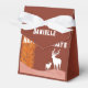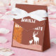 Happy Holidays typography on holiday themed background in brown that includes Christmas Fir trees, moon and the reindeers. Personalised Favour Box.
