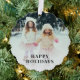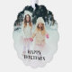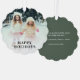 Modern Christmas holiday greeting card that can also be used as a gift tag and a paper tree ornament. The front features your photo overlayed with "Happy Holidays" in elegant typography. On the back, personalise your greeting, names and year in simple typography on a dark sage green background.