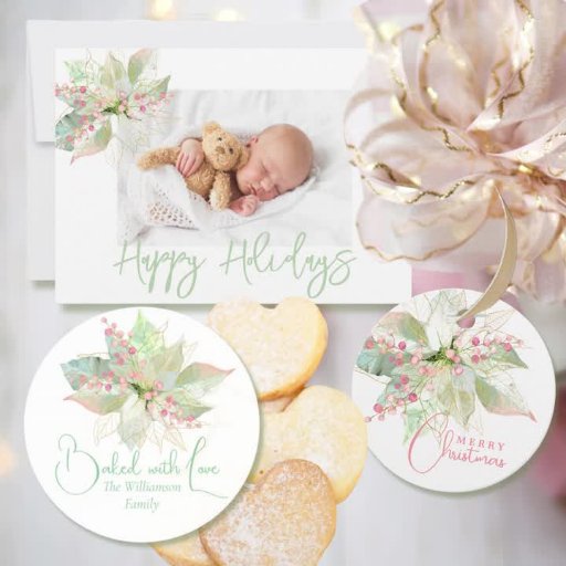 This pastel poinsettia photo Holiday card in pink, gold and sage is so sweet to showcase your family. The soft colours are stylish but with a modern twist