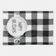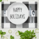 Happy Holidays text on a round white plate and silverware on a white and black buffalo plaid background.