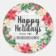 A personalised Happy Holidays sticker with colourful poinsettia plants around the border and a white wood background. A colourful sticker to top off your festive holiday party favours and gifts.